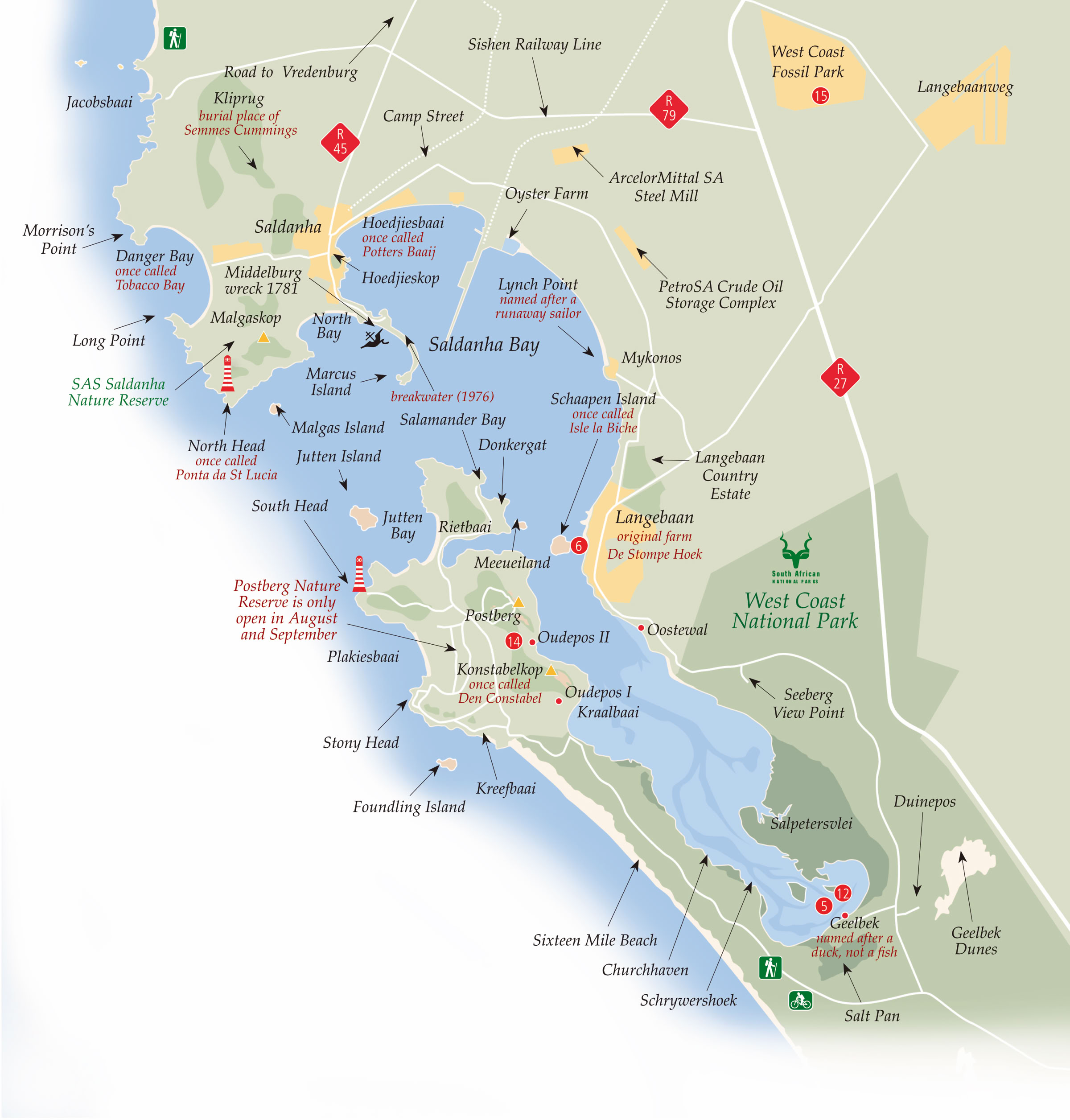 Saldanha Bay: This is the largest and deepest natural harbour in South Africa and is home to the naval training base and the South African Military Academy. SAS Saldanha Nature Reserve, just behind the military base, is worth a visit; there you can also see relics from WWII.The cornerstone of the harbour’s business is fish canning and iron ore exports that started in 1976. Three interesting events are associated with the bay. One concerns Smuts’s Boers firing on a British cruiser in the bay during one of only two naval encounters during the Anglo-Boer War.The British returned fire but no one was hurt – only some cows at Oorlogsvlei (today Tuscaloosa Street, Saldanha). Secondly, after President Kruger’s death in exile in Switzerland, his body was returned to South Africa by sea, and the first people to see it and pay their respects were the townsfolk of Saldanha. Thirdly, the first aeroplane to land here was a Hanley Page in 1919.